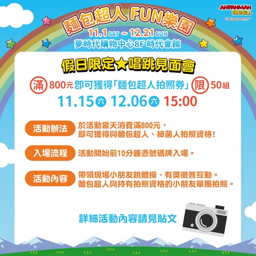 - 活動辦法:於活動當天消費滿800元,即可獲得與麵包超人拍照資格!